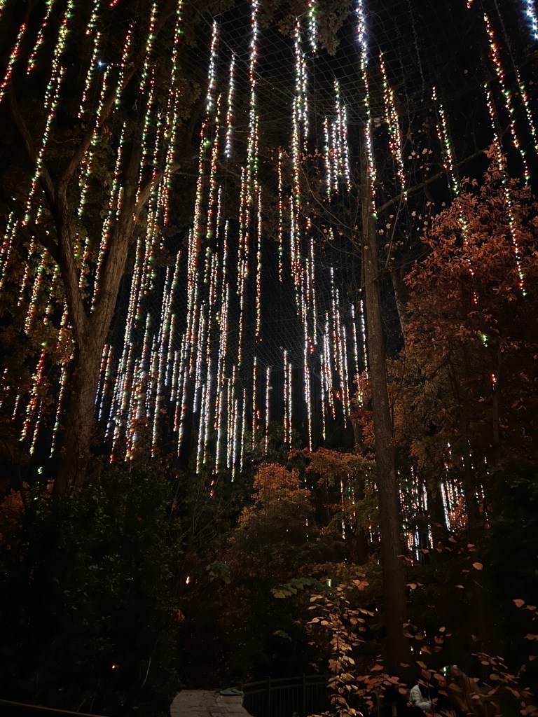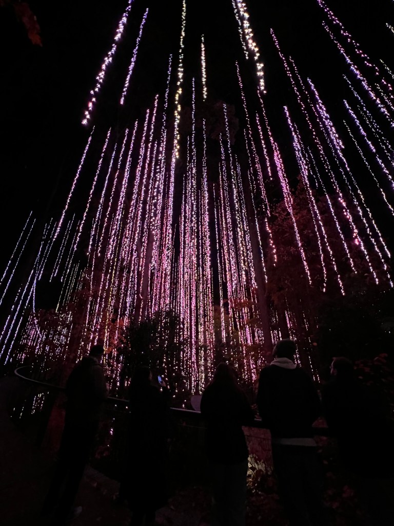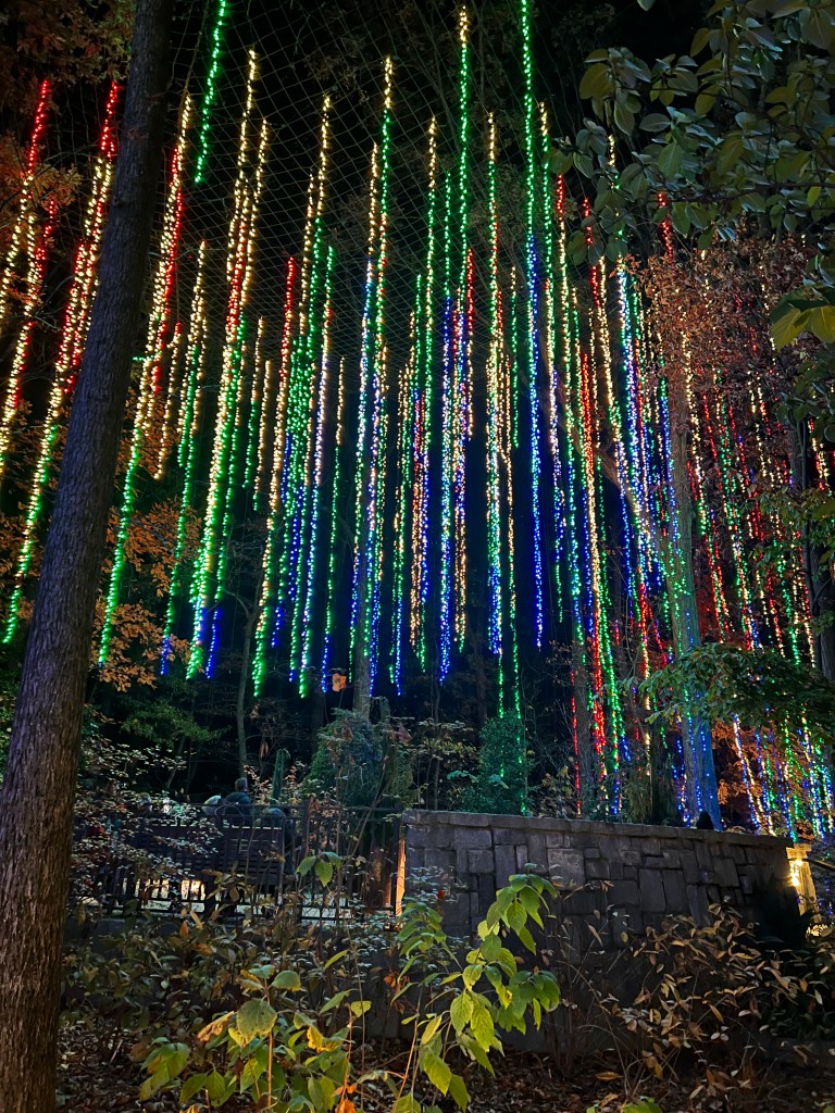While walking around, we decided to use the drink tickets that we received. I got an apple pie, hot apple cider with cinnamon whisky. My aunt got hot chocolate with Irish cream. The servers were very heavy-handed with the alcohol. I’m not mad, but my apple cider put some hair on my chest. 😅 My favorite thing in the area was the rainlights hanging in the trees. The lights were coordinated with music. There were rainbows of light everywhere. Pictures could not do justice. I can tell that I was not the only one that felt this way. Plenty of people stopped to stare at the light show. It was very calming.