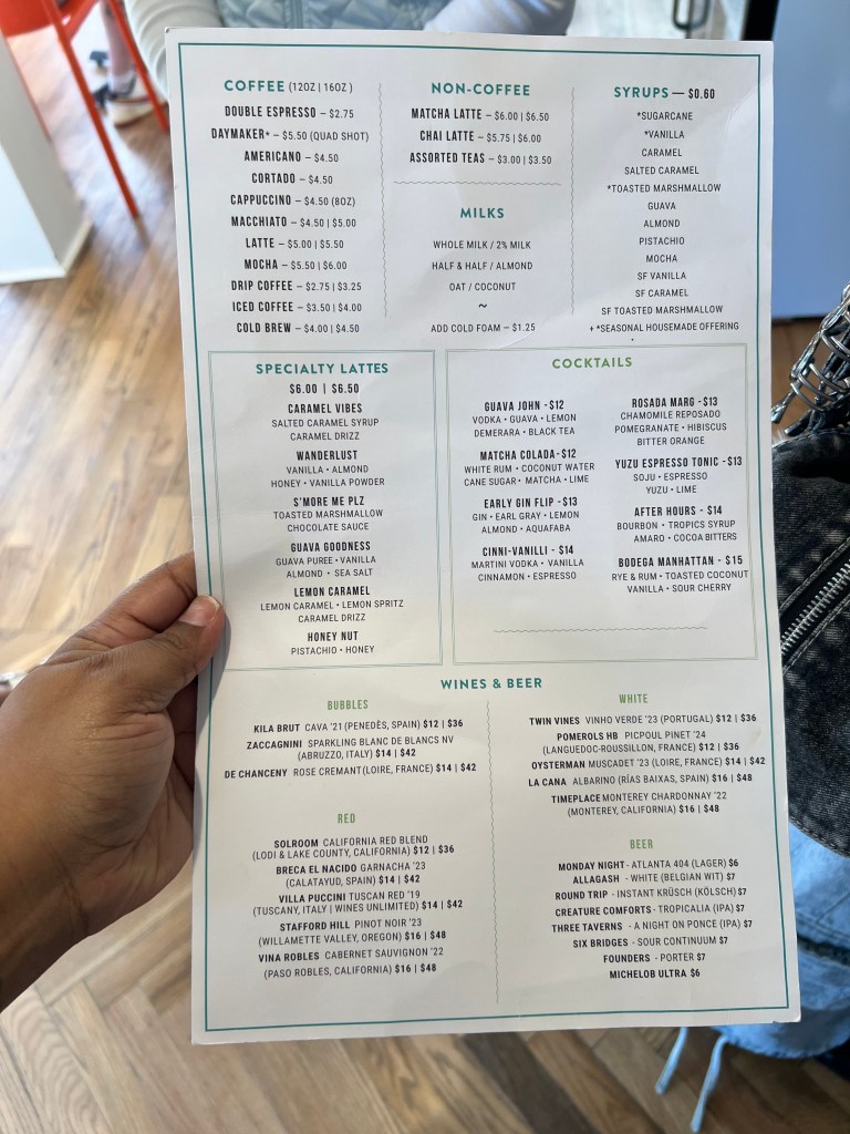 Walking up to the door, the first thing that we noticed was the line. It’s not to be expected that a new café in downtown Roswell would have a line. Granted, we got there around lunchtime. Since my friend wanted to get some work done, we knew that we would have to find seats and a power source. Inside, there was plenty of seating. Right away, we found seats and a power source for her laptop. Because of the line, she stayed seated while I was in line. This gave the chance to look around and see what was going on. The first thing I noticed was that, even though it was their opening week, the place was packed. All the employees wore smiles and didn’t mind answering questions. As someone who has worked in retail, I can tell you that this was a good sign.