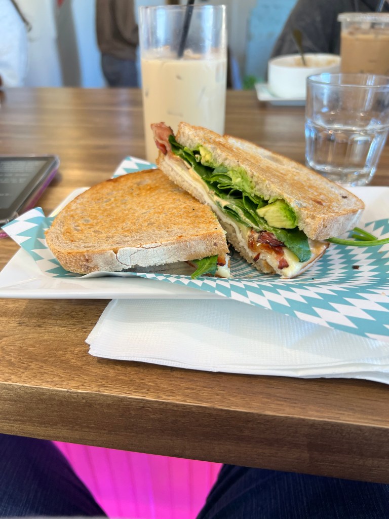 Once I ordered, I grabbed my number and sat down. With as many people as were in there and the line being long, I figured we would have to wait a while. To my pleasant surprise, it couldn’t have been more than 5 minutes before they brought our drinks. Not much longer after that, they brought out our food. I ordered the caramel drizzle with the avocado-turkey BLT. My friend got the matcha latte with the holy smokes.